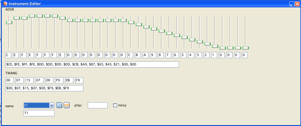 Here you can edit and experiment with the vectrex ADSR and TWANG tables. You can use the resulting data with mod file generation directly - or you can copy/paste the data to your own vecterx BIOS pieces and use them there - the format is identical.