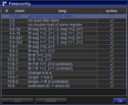 If a peephole is discovered as being valid (all CombinedRules are true) - the sourcecode is changed, and the "result" of a peephole is applied. A peephole can have an arbitrary number of results (lines). Each "OneResult" represents one output line. The outputline is generated with the same identifiers as given above.