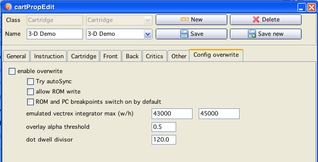 Here you can enable for each cartridge some selected "overwrite" values that change the emulator. This is mainly intended for roms that have special "needs" to display correctly. ROMS with known bug, that would otherwise invoke a debug popup (rom write), display sizes (Frogs "EmptyScreentro" should be displayed outside the emulation display to achieve its effects - but each vectrex has that different, and per default Vide has a LARGE display range) etc. Spinball does not run well with the autosync feature - that is no bug (on neither side) - just a fact.