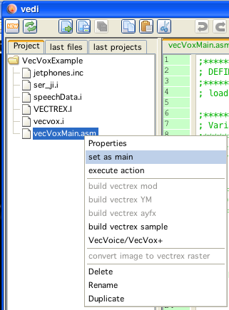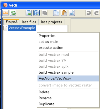 VecVoice/VecVox editing and building code is generated in vedi, using the popup on the project file tree. By chosing the entry "VecVoice/VecVox+" the appropriate dialog is displayed (see also the vedi→VecVoice/VecVox+ documentation).