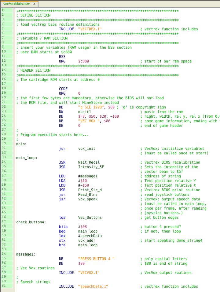 A vectrex playable binary file can be generated by setting the generate vecVoxMain.asm file as the main file in the project.
