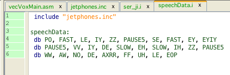 the output of data to vecvox is initialized by storing the address of the speech data to the RAM variable: vox_addr