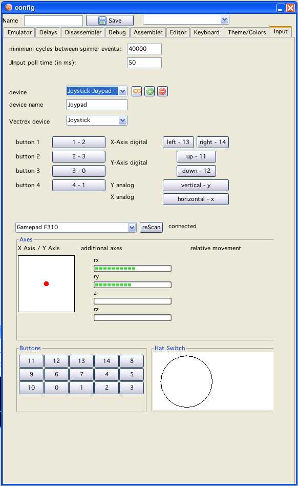 Here you can configure additional input settings for different inout "hardware" for use with the emulator. The code is based on the "JInput" library.