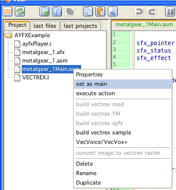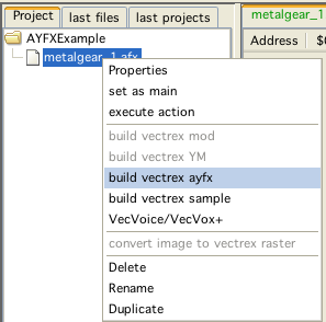 Selecting "build vectrex ayfx" converts the ayfx files directly (no dialog, although you can edit ayfx files, for this you must use the ym-dialog):