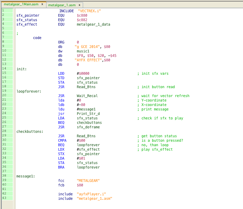 A vectrex playable binary file can be generated by setting the generate "metalgear 1Main.asm" file as the main file in the project.
