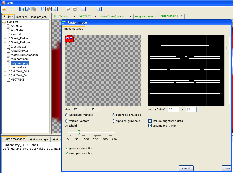 On a popup you can convert images (png, bmp, gif and jpg) to vectrex raster images, but I wouldn't get my dreams up to high, image results in resolutions greater than about 150x100 "pixel" are probably out of the 30000 cylce limit! Raster display routine were hacked together in one afternoon, so you are invited to get more performance out of it!